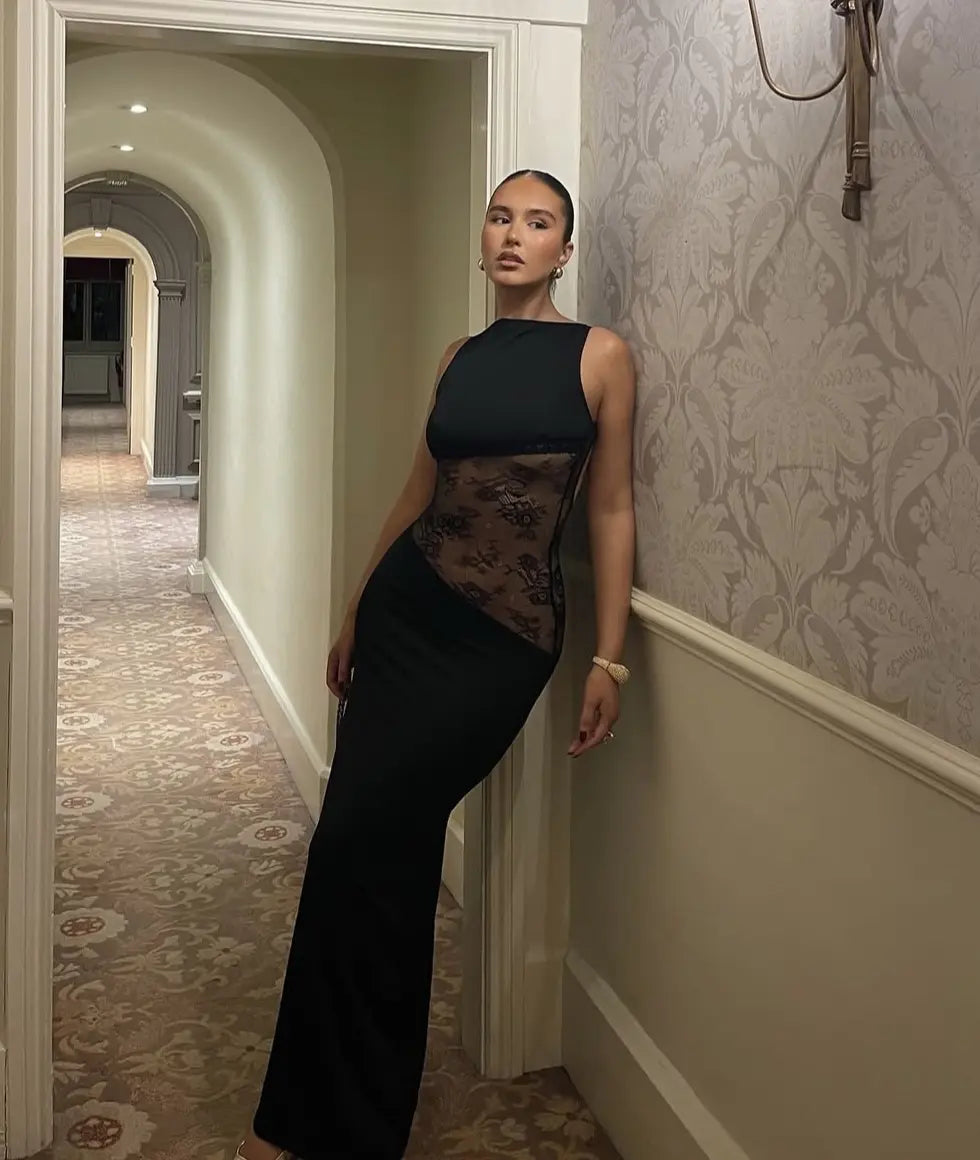 Make a statement in the Lucinda Mesh-Waist Maxi Dress, featuring a sheer lace back, sleeveless design, and a flattering mid-waist silhouette. Perfect for elegant evenings, parties, or special occasions, this long maxi dress blends sophistication with a touch of allure.